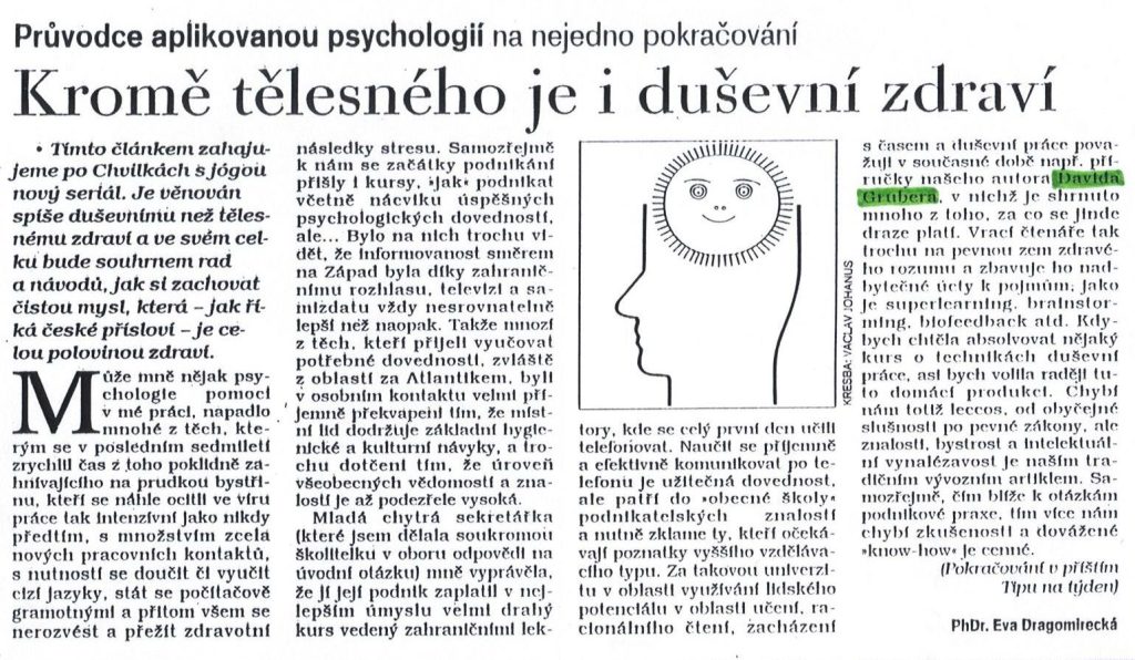 Nejvíce byla pro mne potěšitelná první polovina devadesátek, kdy se vyrojila spousta nezávislých svědectví (dopisy, články v médiích, osobní setkávání…), že originální kreativní český grubrovský multimetodický přístup k měkkým dovednostem si namazal na chleba a o parník překonal i ty největší (a nejdražší) americké guru. Asi jako moderní notebook o parník překonává mechanický psací stroj.
